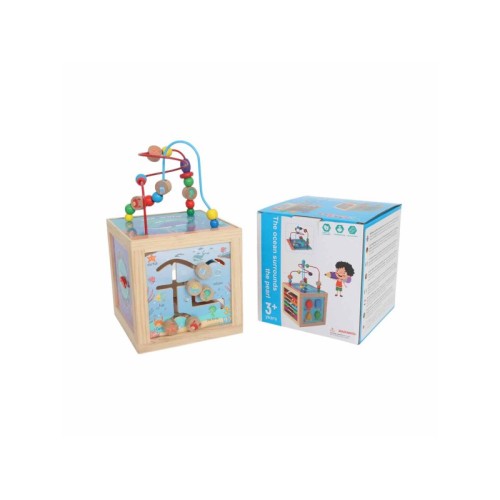 | Karakteristike | Drvena edukativna didaktička kocka sa motivom okeana nudi više igara u jednom: lavirinti sa perlicama i motivima, abakus, sat i slaganje oblika. Podstiće razvoj motoričkih veština, koordinacije i prepoznavanja oblika i boja. |