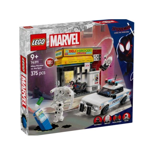 Komplet za igru sa Spajdermenom sadrži 4 mini-figure: Majlsa Moralesa, Mrlje, Gven Stejsi i pozornika Džefersona. Supermarket ima funkciju eksplozije zida koja omogućava da se bankomat skine. Među dodacima su dugačko, fleksibilno uže od mreže i fleksibilna mreža koja je dovoljno velika da zarobi mini-figuru. Policijski automobil se otvara da omogući da se 2 mini-figure stave unutra. Za dodatnu digitalnu zabavu graditelji mogu da uveličaju, rotiraju modele u 3D i prate napredak pomoću zabavne, intuitivne aplikacije LEGO Builder.