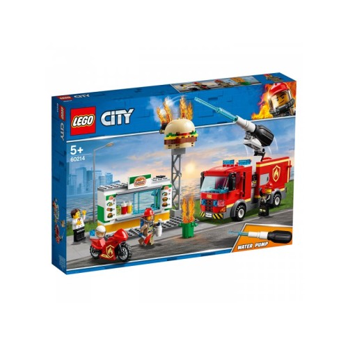 | Karakteristike |    Težina 0.581 kg   Dimenzije 38.2 × 26.2 × 5.7 cm   Bar-kod    5702016369267   Preporučeno za uzrast    5+   Naziv na Engleskom    LEGO City 60214 Burger Bar Fire Rescue   Delova (kom)    327   Deklaracija    Naziv proizvoda: Dečija igračka – LEGO kocke; sastav: Plastika; jed. mere: komad; proizvođač: LEGO System A/S, Bilund, Danska; zemlja porekla: EU; uvezeno iz: EU   |