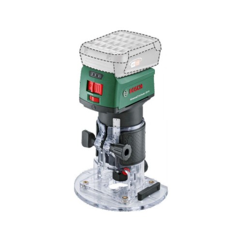 | Karakteristike | Broj obrtaja u praznom hodu 10,000 - 30,000 min⁻¹ Prihvat alata 6 mm / 8 mm Dužina 120 mm Širina 140 mm Visina 186 mm Težina bez akumulatora 1,1 kg Primena Optimizovana za obradu ivica i skraćivanje laminata Funkcije Prihvat alata od 6mm i 8mm Fino podešavanje dubine glodanja Kompatibilnost sa 18V Bosch akumulatorima |