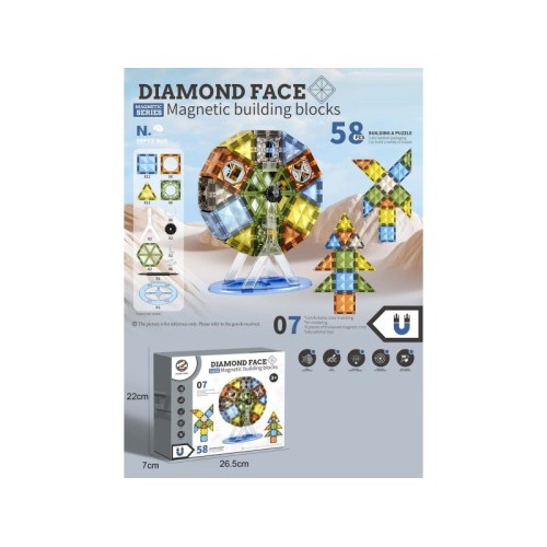| Karakteristike | Komplet od: 58 delova. U setu: magnetne pločice različitih oblika i boja za sklapanje 3D oblika ili slagalica. Materijal: ABS plastika. Dimenzije pakovanja: 26,5x7x22 cm (vdš). Težina: 1300 g. Magnetni kreativni set – igra i učenje u jednom! Napravite 2D slagalice, napravite panoramski točak ili izmislite potpuno nove oblike. |