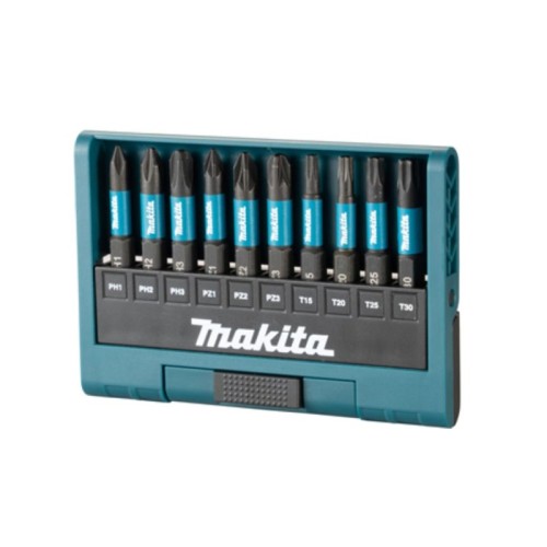 | Karakteristike | Set udarnih bitova Makita Impact Black serije, u plastičnom držaču. Zbog velikog obrtnog momenta pogodan i za udarni odvijač. Ovaj set se sastoji od sledećih udarnih bitova: Phillips Phillips bit PH1 - PH2 - PH3; Phillips Pozidriv bit PZ1 - PZ2 - PZ3; Tork bit T15 - T20 - T25 - T30; 1/4" oblik E-oblika, dužine 50 mm. Crni premaz otporan na rđu obezbeđuje duži životni vek bitova. Bolje se uklapaju od standardnih Makita šrafova. Lako prepoznatljivi bitovi zbog laserske oznake tipa.