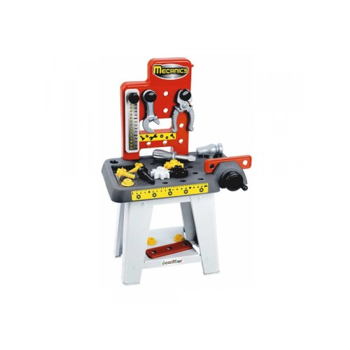 | Karakteristike | Uzrast: 18+ meseci Materijal: plastika, karton Dimenzije: 38 x 24,5 x 60 cm Set sadrzi: stočić radionicu sa stegom i policom, šrafciger, čekić, klešta, francuski ključ, metar, 3 zupčanika, ekser, šraf, letvicu |