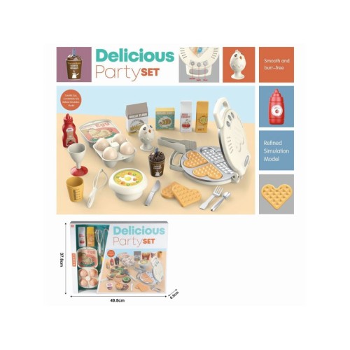 | Karakteristike | Set od 20 delova:1 aparat za vafle sa zvukom i svetlom,posude,namirnice. Materijal:plastika Dimenzije: 37,8×6,5×49,8 cm.Težina:950 g.Ovaj set karakterišu šarene boje i realističan dizajn. Mališani će uživati u igrici pravljenja doručka:priprema vafla,rezanje pice,kuvanje kafe ili igranje uloge pizza majstora u restoranu brze hrane. |