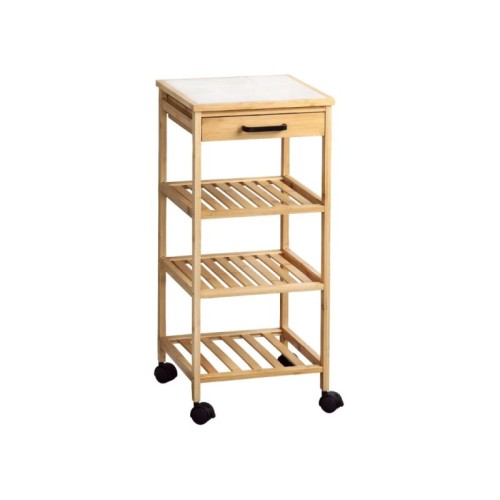 | Specifikacija | Materijal: Bambus Visina: 73 cm Širina 34 cm Dubina 34 cm Težina: 5.1 kg Boja: Braon Idealno rešenje za čuvanje i serviranje u kuhinji Opremljena je sa tri prostrane police, fiokom i izdržljivom radnom površinom od keramičkih pločica Odlično će se pokazati kako tokom kuvanja, tako i u ulozi mobilnog bara Radna površina otporna na visoke temperature Točkići sa kočnicom obezbeđuju stabilnost i jednostavno pomeranje Točkići sa mogućnošću blokade za udobnu upotrebu |