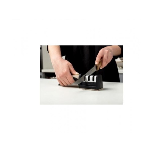 Karakteristike | Težina : 0,16kg Dimenzije : dužina : 21,5cm , visina 6,5cm , širina 5cm Trostepeni sistem : Prvi služi za oštrenje i obnavljanje ivice , drugi precizno zaglađuje, a treći za fino poliranje . Materijal : telo-visokokvalittena plastika , oštrači - kombinacija čelika I keramike . Glava brusilice se može ukloniti tadi lakšeg čišćenja . Nije pogodan za keramičke noževe . Nekoliko puta provučete nož kroz proreze oštrica i postaje kao nov. Koristitie kuhinjske rukavice radi dodatne mere opreza . Držite oštrač na ravnoj površini . |