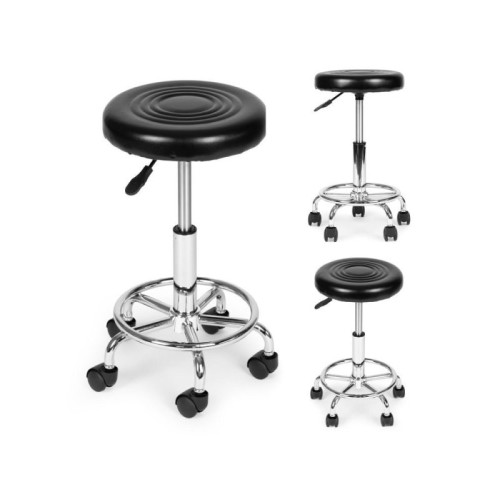 Karakteristike Praktična rotirajuća stolica brenda ModernHome idealna je za kozmetičke i medicinske salone, kao i za kancelarije. Odlikuje je stabilan metalni ram i postolje sa pet točkića u obliku zvezde, koje omogućava lako pomeranje i štiti pod od ogrebotina. Sedište je ispunjeno udobnom penom debljine 5 cm i obloženo lako perivom PVC kožom. Zahvaljujući funkciji rotacije od 360°, položaj možete menjati bez ustajanja. Visina stolice se podešava pomoću pneumatskog mehanizma, što omogućava brzo prilagođavanje potrebama korisnika. Maksimalna nosivost je 114 kg.